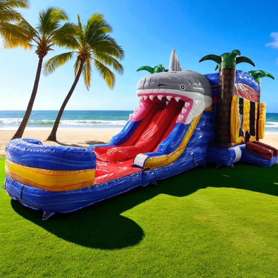 Bring the thrill of the ocean to your next party with the XL Shark Attack Combo Wet/Dry. This shark themed bounce house with slide combo delivers big fun. It converts easily from dry play to a wet splash slide. Perfect for birthday parties, school events, and backyard fun. Fast setup. Safe design. Crowd-pleasing theme.