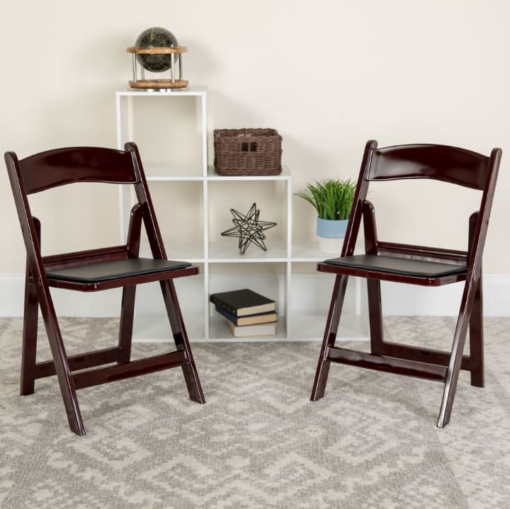 The Mahogany Resin Folding Chair combines comfort and elegance that looks good at all your special events, whether it’s a backyard barbeque, a formal banquet or beach wedding. This chair is made from ultra-strong resin that’s very lightweight, yet extremely strong and can hold up to 500 pounds.