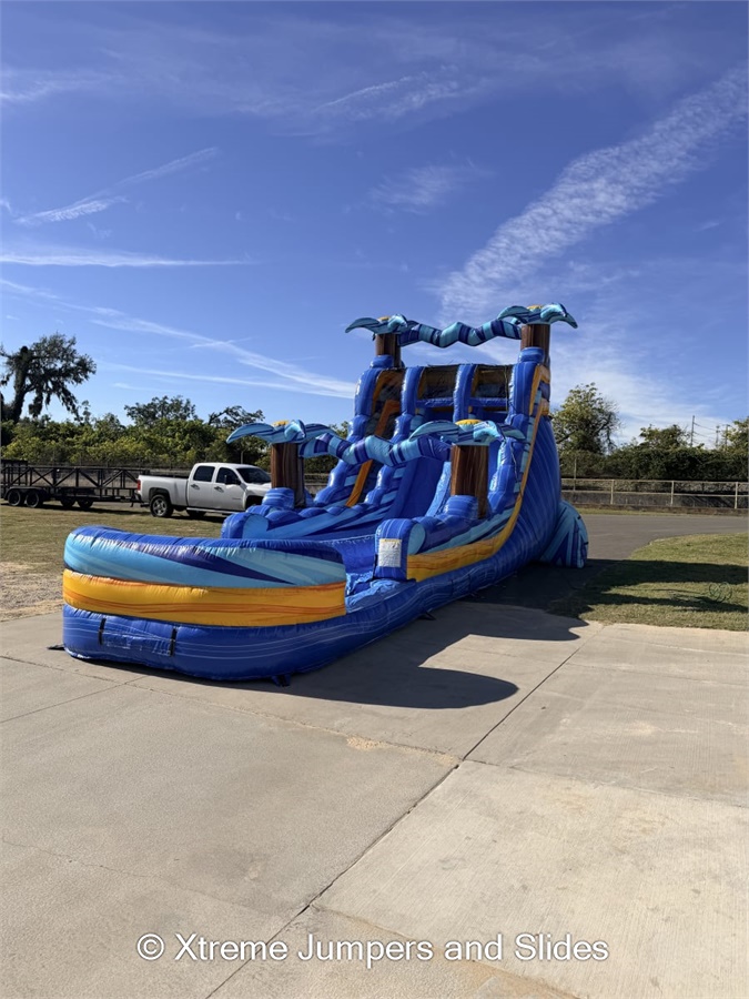 The 20' Flashpoint Dual Lane Hybrid Water Slide is a show-stopping blue and yellow inflatable with 3D palm trees. Fast lanes. Smooth landings. Dual lanes let two riders race side-by-side for max excitement. Ideal for backyard parties, community events, and summer celebrations in Dade City, Zephyrhills, Wesley Chapel, Tampa, Land O Lakes, San Antonio, Orlando. ✨